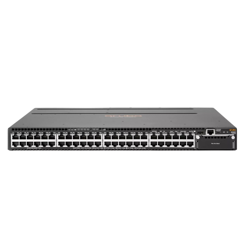 The HPE Aruba 3810M features 48 10/100/1000 Ethernet ports and 4 SFP+ ports for uplink connectivity. These ports support advanced features such as auto-sensing and auto-negotiation for streamlined deployment.