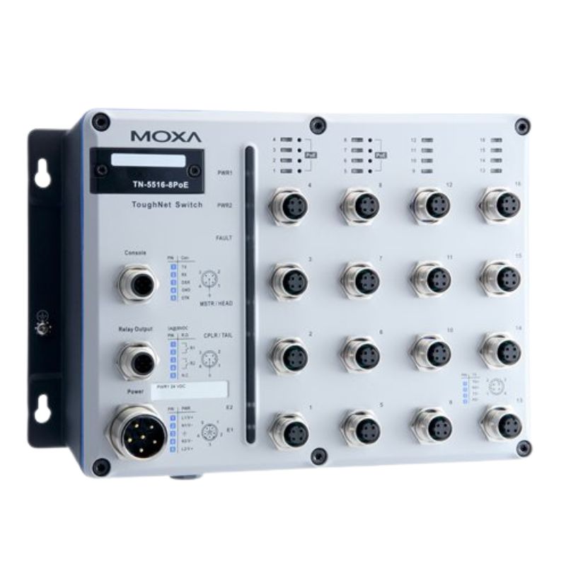 Discover the power and versatility of the Moxa TN-5516-8POE-24-T Managed Ethernet Switch, designed to meet the needs of industries that demand reliable and high-performance networking. This robust device features 16 ports, providing extensive connectivity options and ensuring a seamless network experience for critical applications.